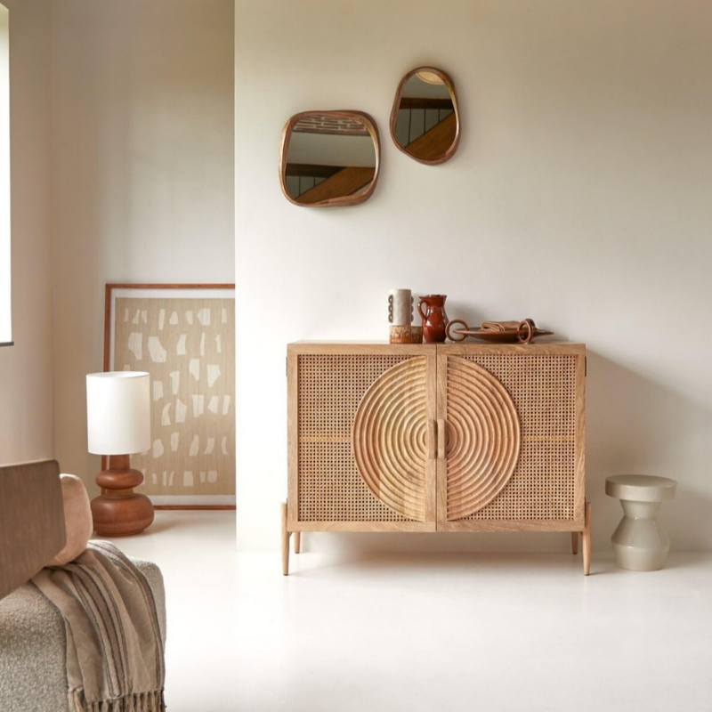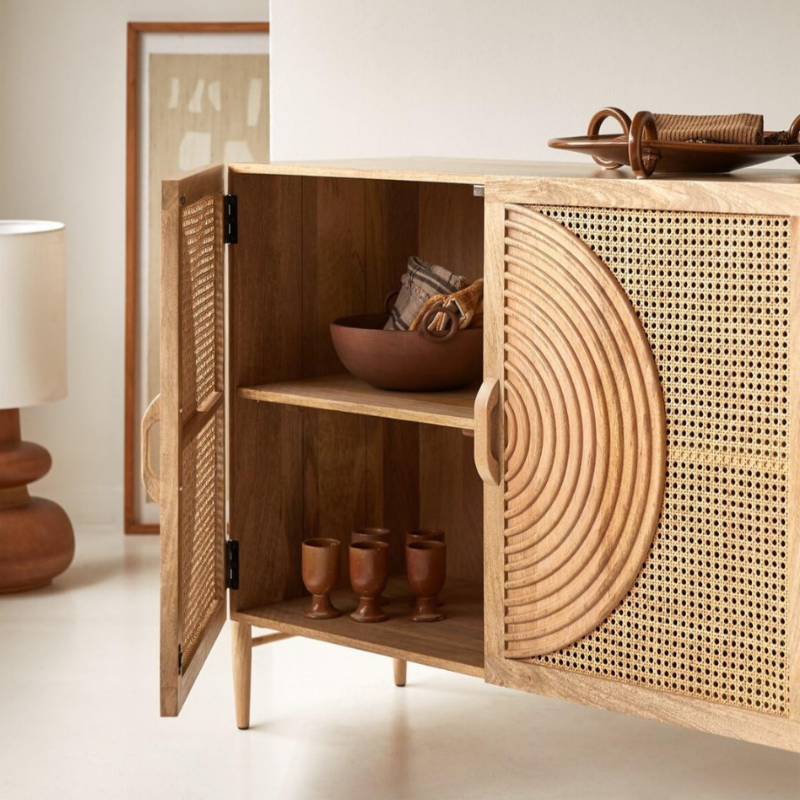 This Storage cabinet apply mango solid wood and front door apply cnc work with bamboo cane.