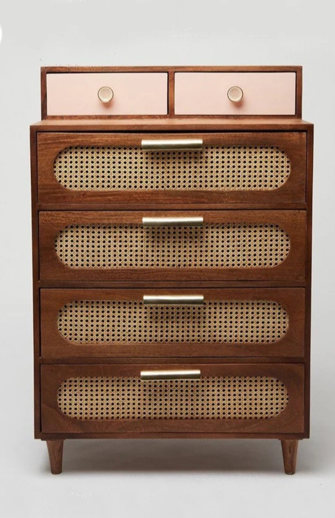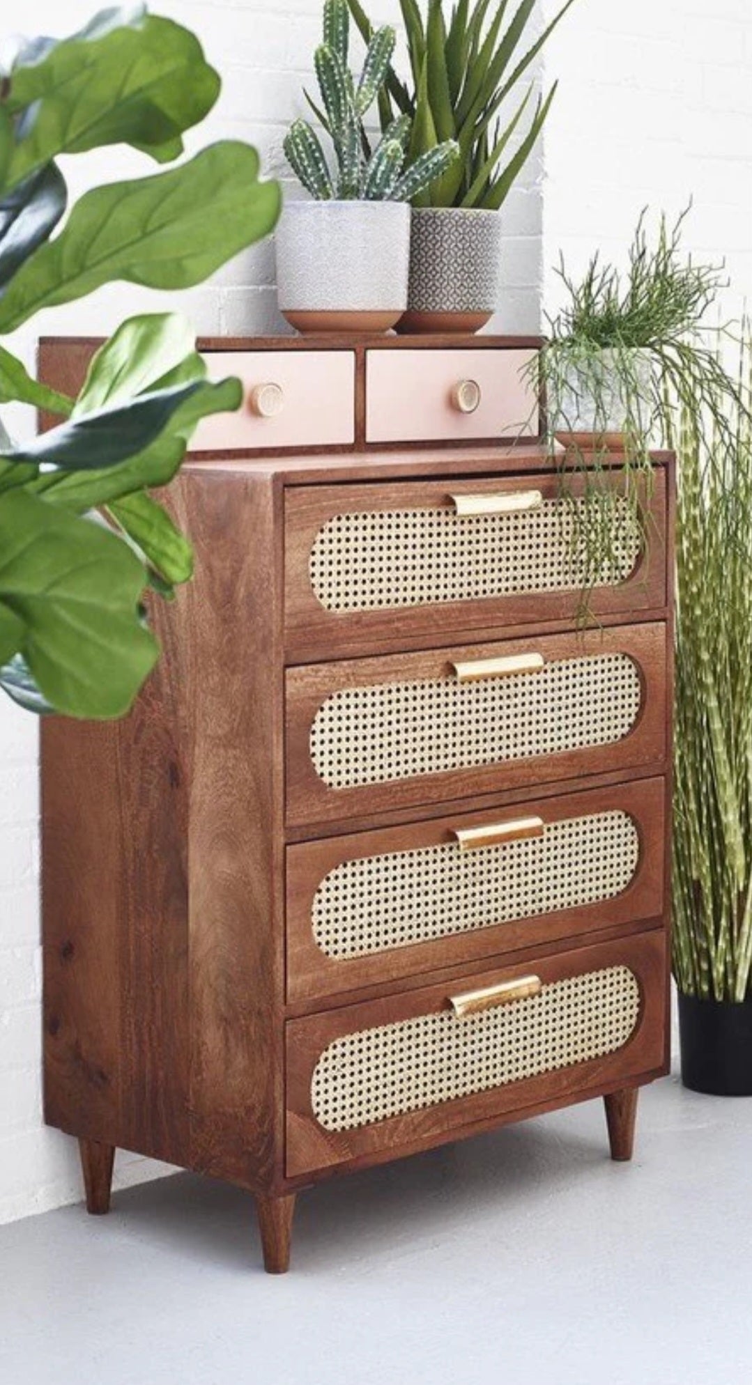 This chest of drawer made by Acacia solid wood and front show four drawer bamboo cane fitting.